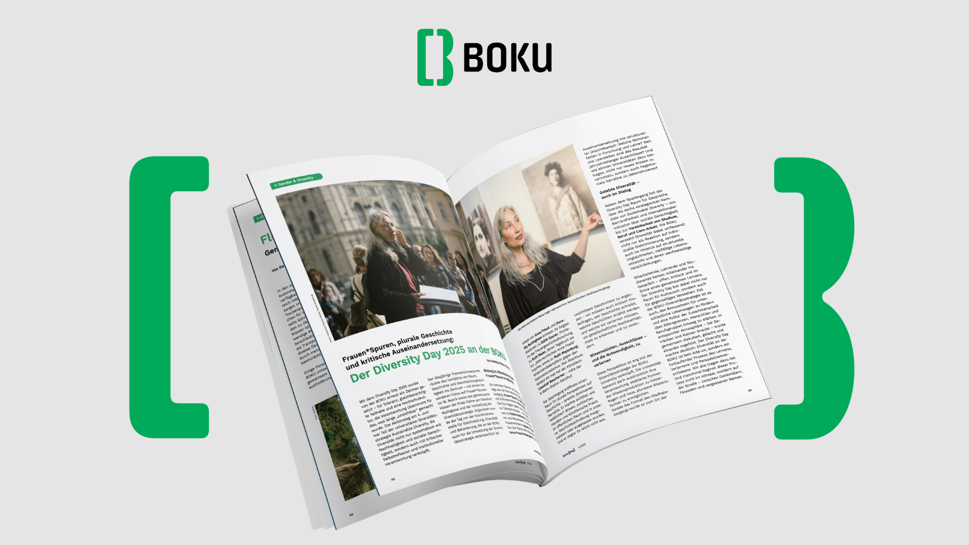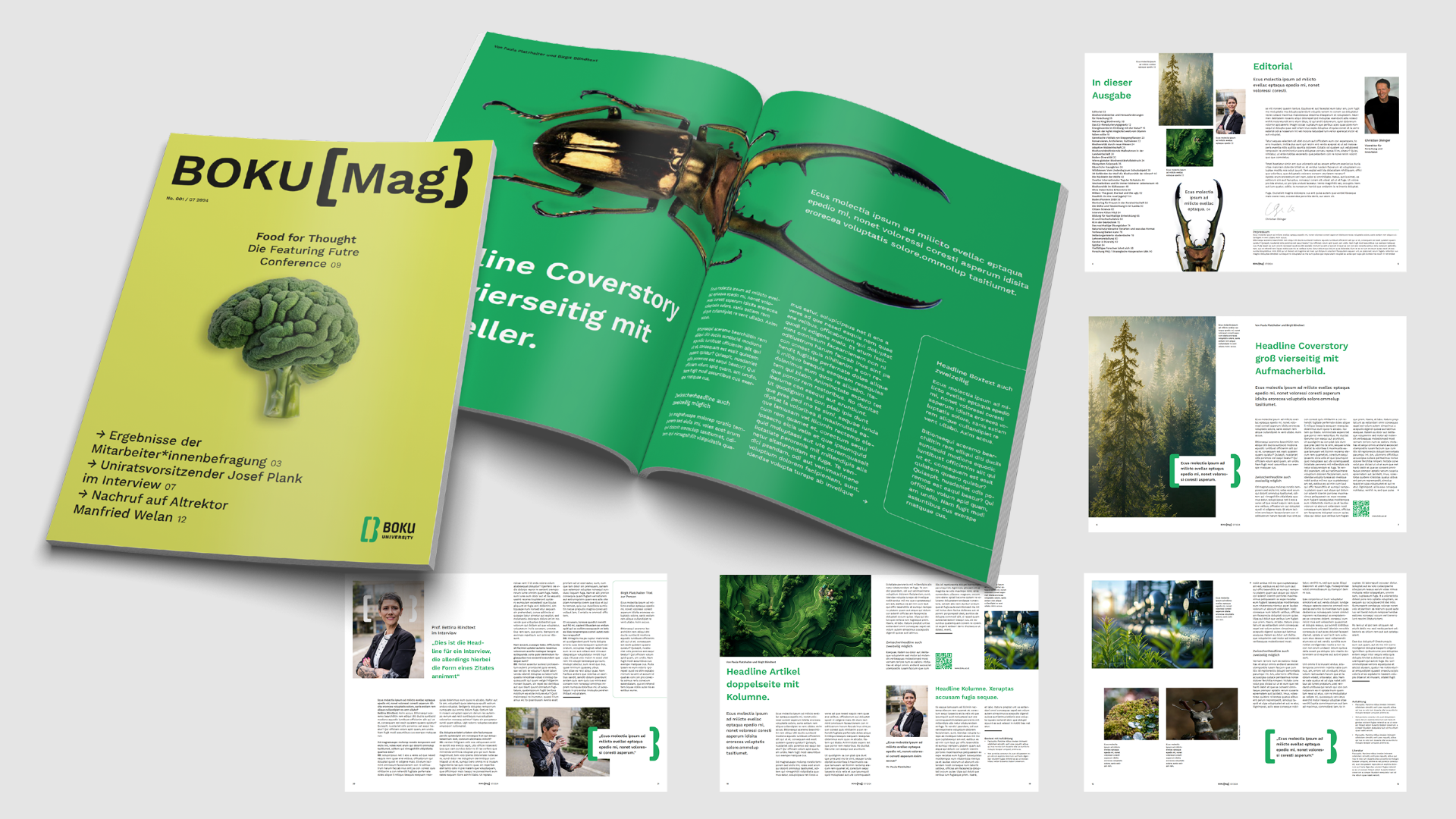 Im Zentrum des Designkonzepts stand der Anspruch, ein Gestaltungssystem zu schaffen, das sowohl die inhaltliche Tiefe als auch die Vielfalt der Themenwelten der BOKU Wien angemessen transportiert. Das Ergebnis ist ein flexibles, modulares Editorial Design, das sich mühelos an unterschiedliche Inhalte und Formate anpassen lässt – sei es für klassische Printpublikationen, interne Berichte oder digitale Anwendungen.