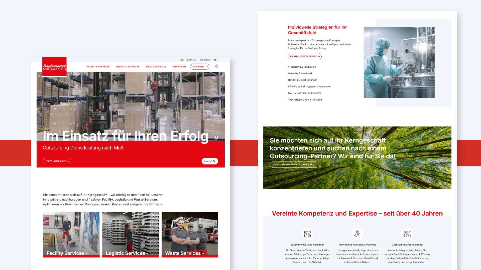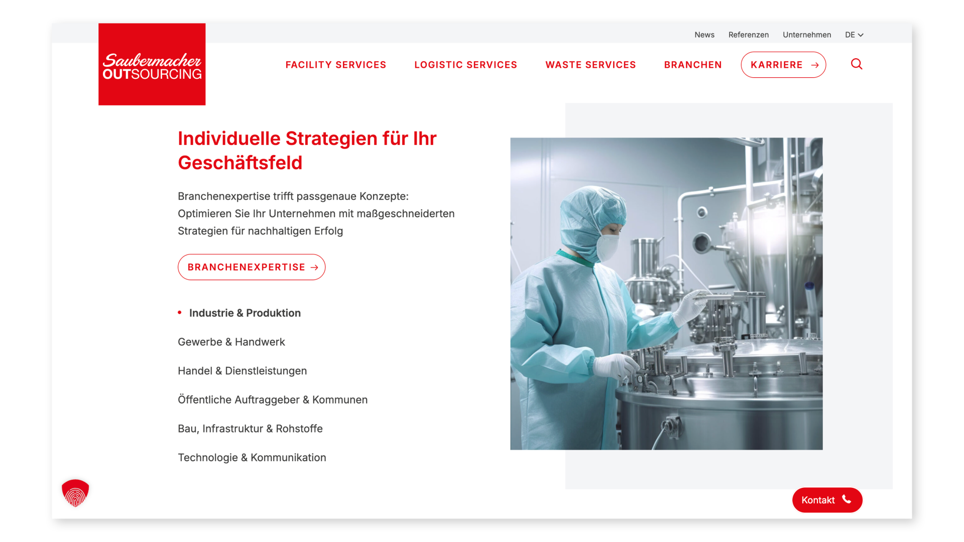 Das Design präsentiert sich modern, vertrauenswürdig und professionell – passend zur Marke Saubermacher. Großflächige, symbolstarke Bilder visualisieren die adressierte Branche und transportierten Werte auf ansprechende Weise. Die kräftige Farbwelt (rot-weiß) und hochwertige Bildsprache unterstützen wiederum die Corporate Identity.